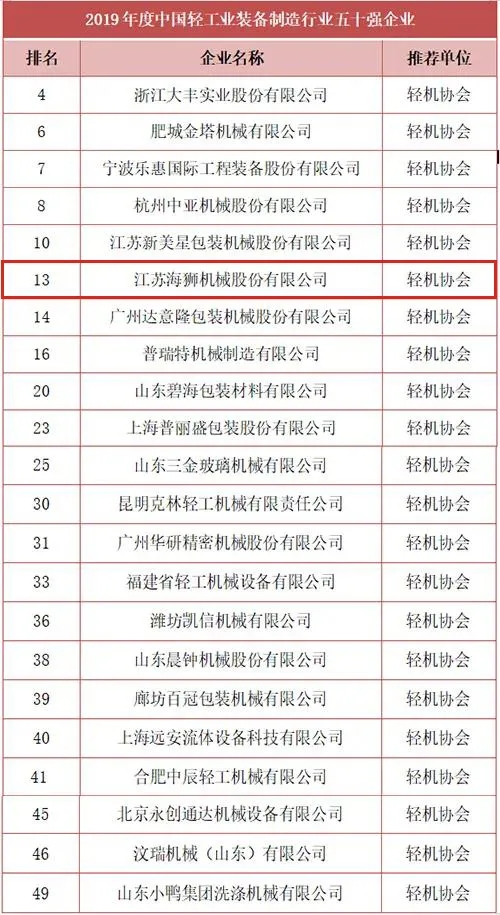 由中國(guó)輕工機(jī)械協(xié)會(huì)推薦的有22家企業(yè)榮登2019年度中國(guó)輕工業(yè)裝備制造行業(yè)五十強(qiáng)榜單,海獅機(jī)械排名第13位。